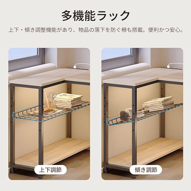【再進化!Type-Cを搭載した多機能L字デスクが新登場!】 Bestierの最新L字デスクは、従来のデスクを全面的にアップデートし、2つのAC差込口、1つのType-Cポート、1つのUSB-Aポートを搭載しています。これにより、一度に3台のデバイスを高速で充電可能です。さらに、配線もスッキリとまとめられ、作業環境が整います。 このデスクは、左右入れ替え可能な収納スペースを持ち、使用習慣や部屋のレイアウトに合わせてカスタマイズできます。メッシュパネルは3つの異なる高さと傾斜角度に調整可能で、落下防止設計も備えています。フック付きでバッグやイヤホンの収納も便利です。 また、RGB LEDライトを搭載し、20種類のモードと7つのカラーを自由に選べるため、自分だけのゲーム環境を作り出すことができます。仕事とゲームの両立が可能です。 デスクは高強度のメラミン化粧板を採用し、汚れ、キズ、熱、水分に強く、長持ちします。天板裏のスチール製フレームが安定性を確保し、激しいゲーム操作にも耐えられます。簡易取付工具とわかりやすい取り付け説明書が付属しており、お一人でも1時間以内に組み立てが可能です。