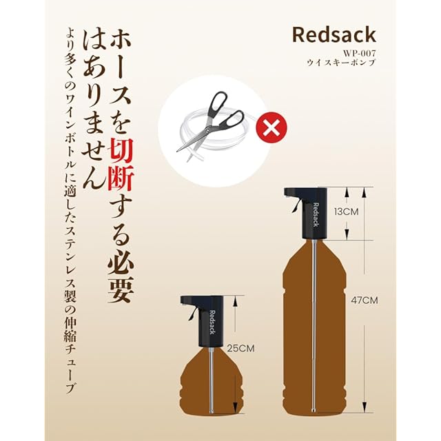 内蔵充電式バッテリー、バッテリー交換の手間なし、残量表示、使用後は必ず水を汲み上げてウイスキーポンプとチューブをきれいにし、ウイスキーポンプは水洗いできませんので、タオルで拭いてください