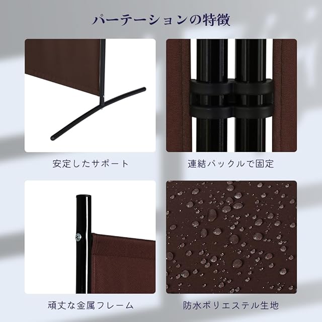 【組み立て簡単】 全体サイズ:高さ180cm×幅260cm。カラー:ブラウン。おしゃれ衝立は防水生地でできており、お手入れも簡単です。取り付けも簡単で、1人で20分以内に部屋パーテーションを組み立てることができる。屏風についてご不明な点がございましたら、お気軽にお問い合わせください、弊社はできるだけ早く問題を解決するお手伝いをいたします。