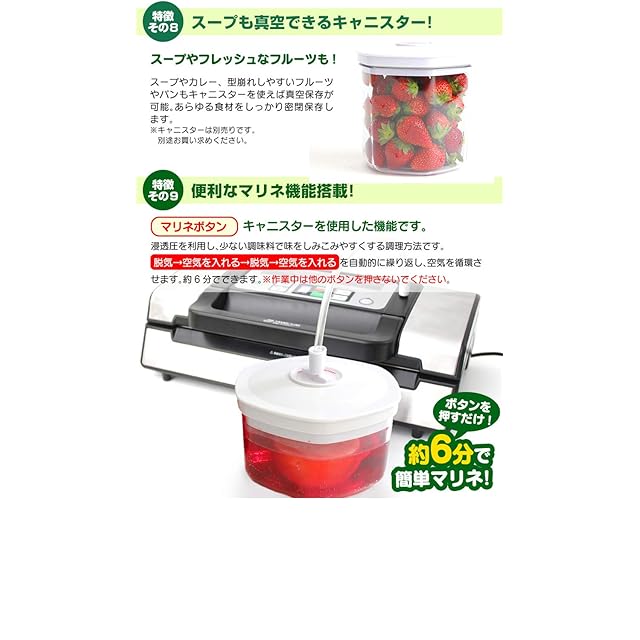 真空パックん最上位モデル登場!ダブルポンプ仕様で強力な吸引力。2重シールで更に強力に密封。ハンドル型のロック方式で操作がしやすくなりました。丈夫なステンレスボディ。LEDタンプでステータスを表示。シール時間が3種類(短め、普通、長め)。パルスボタンにより、お好みの強さで脱気できます。別売キャニスターなどをご購入の際は、真空パックん関連商品対応表をご確認ください。