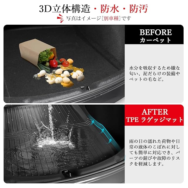 【厚手の素材と防水・防汚機能】当社のフリードラゲッジマットは高品質な厚手の素材で作られており、優れた防水・防汚性能を誇ります。泥だらけの装備やペットの毛など、さまざまな汚れにも対応可能です。タオルで拭き取るか、掃除機で簡単に清掃でき、従来のカーペットタイプと異なり、水分を吸収しないため嫌な匂いも防げます。フリード防水マットで車内を清潔に保ち、長持ちさせることができます。