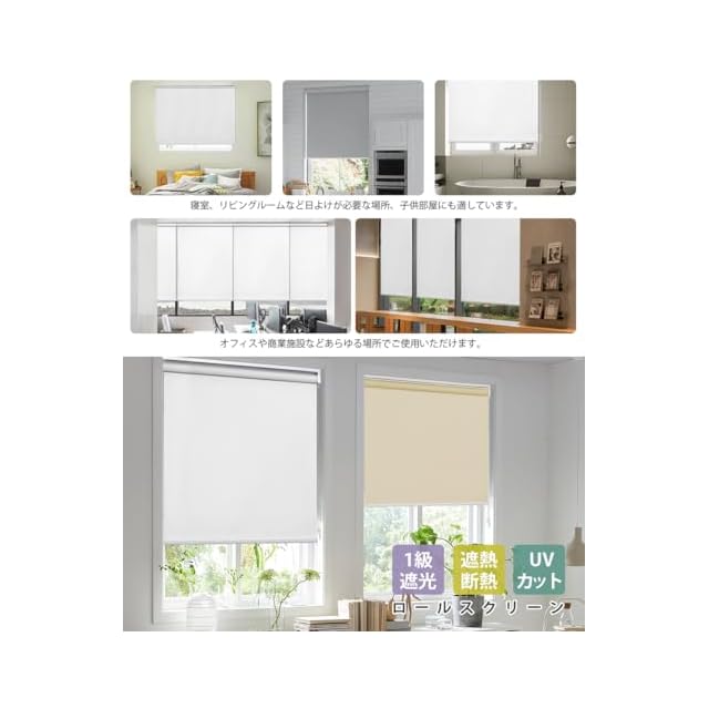 【使える場所】ロールスクリーンは、家庭やオフィス、店舗などさまざまな場所で使えます。主に窓やドアに取り付けて、光や視線を調節したり、プライバシーを確保したりするのに便利です。また、部屋のインテリアにも馴染みやすく、スッキリとした印象を与えることができます。個人用には子ども部屋、寝室、小窓、リビング階段、キッチン、浴室、台所、脱衣所等。業務用にはオフィス、事務所、ホテル、病院、レストラン、美容室等。
