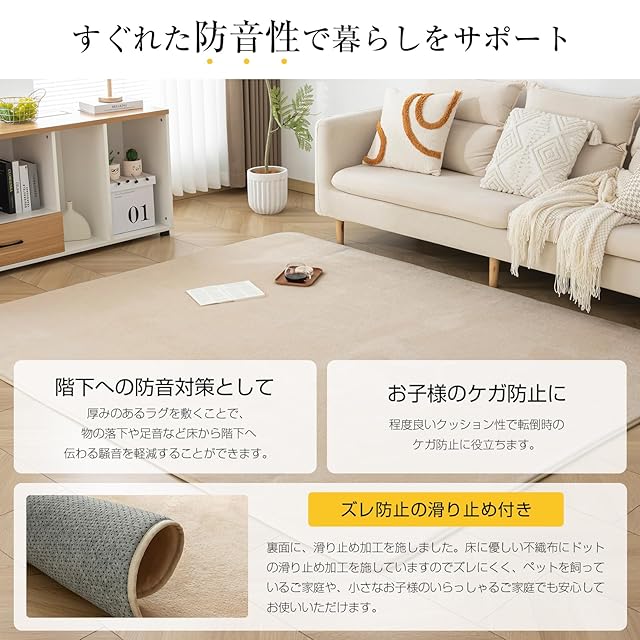 【低反発カーペット】厚さ約15mmの低反発ラグマットは、ふんわりとした踏み心地で、底付き感を感じることなくゆったりとリラックスできます。体圧をバランスよく分散するため、長時間座っていても疲れにくい設計です。ウレタンクッションによる防音効果も抜群で、物の落下音や足音など、床から階下へ伝わる騒音を軽減し、防音ラグとして、快適な暮らしをサポートします。