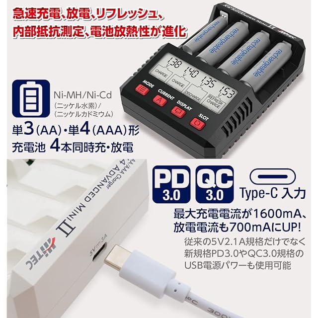 【急速充電、放電、リフレッシュ、内部抵抗測定、電池放熱性が進化】Ni-cd/Ni-MH (ニッケル水素/ニッケルカドミウム)単3・単4形充電池4本同時充・放電。※本製品に充電対象バッテリー、電池等は含まれておりません。