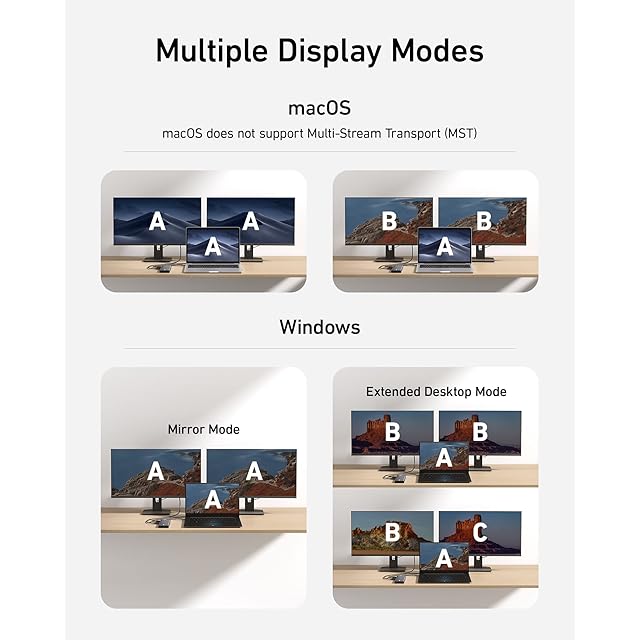 複数画面出力:それぞれ単ポート利用時は、HDMIポートで最大4K (60Hz)、DisplayPortで最大4K (60Hz) での出力が可能です。 (※Mac OS搭載機器は、複数ディスプレイにそれぞれ異なる画面を表示することはできません)
