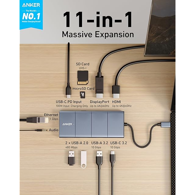 Anker 565 USB-C ハブ (11-in-1) 10Gbps 高速データ転送 4K HDMIポート DisplayPort 100W USB PD対応 USB 3.2 Gen 2 USB-Cポート USB-Aポート イーサネットポート 搭載 Anker 565 USB-C Hub (11-in-1) B2C | primer