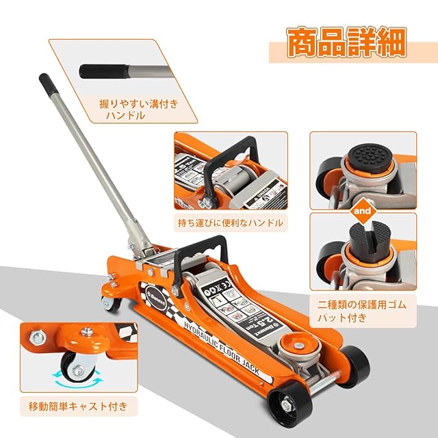 【商品仕様】商品内容:本体×1;ジャッキタッチメント・サドル30㎜/15mmX2個;カラー:オレンジ;GS、CE基準に適合している安全性が高い製品であり。