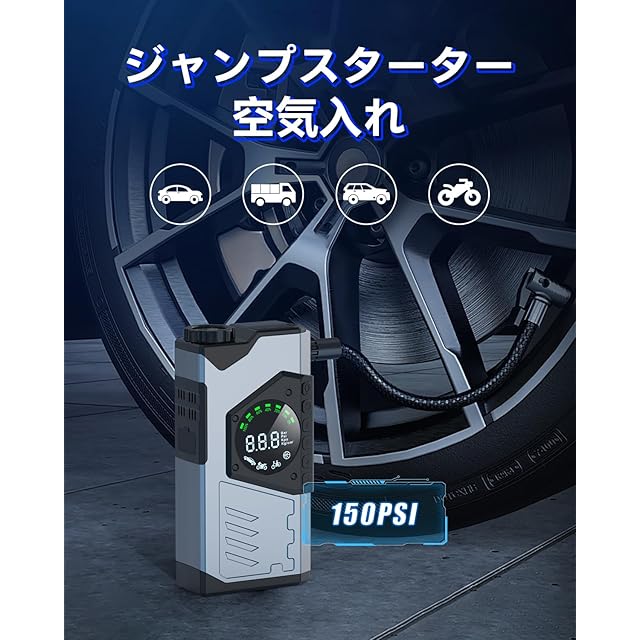 【タイヤに電動空気入れ】これジャンプスターター一台で気軽にタイヤに空気を入れることができます。圧力計が付で簡単にタイヤ内の空気圧を計測できます。4種類の空気圧モー ドと圧力単位がオプションであり、使いやすい。150 PSIの強力な空気圧縮機は、タイヤを2分以内に20 PSIに空気を入れることができます。車だけではなく、オートバイ、モーターボート、軽トラ、ボールなどにも適用です!