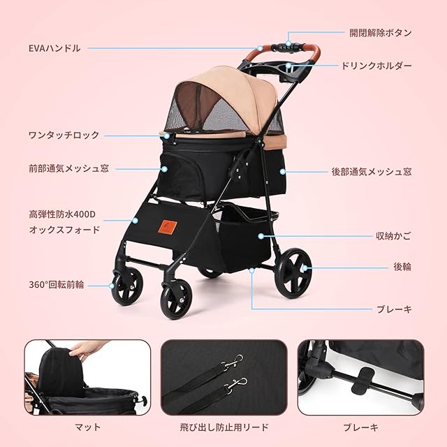 便利:ワンボタンでボタンを押せば、家にいても外出しても使わないときは簡単に折り畳んで収納できます。軽量設計なので1人でも持ち運びやすい、とても便利です。コンパクトだから、玄関や車のトランクなどの狭い空間にも保管できます。犬用ベビーカーのハンドル部分にはドリンクホルダーと小物入れ付き!下のカゴに荷物も入りできます。マットレスを取り外せて丸洗いできますので、抜け毛やにおいが残りがちなキャリーをいつも清潔に保てます。それにバスケットの左右どちらからでも開閉でき、最大180度開口部が大きく開くので、ペットの乗り降りスムーズに、ケアもやすくなります。