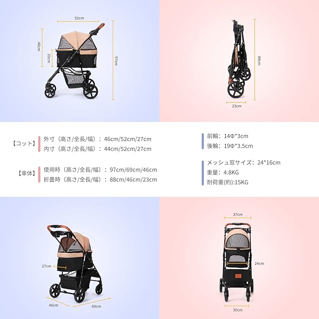 仕様:愛犬・愛猫のお散歩に便利なペット用カートです。犬バギー展開サイズ(約):長さ46 *幅69 *高さ97(cm)、 収納サイズ(約):長さ23 *幅46 *高さ88(cm)。フレーム:スチール製、生地:400Dオックスフォードポリエステル、車輪:EVA、本体重量(約):4.8KG、耐荷重(約):15KG。
