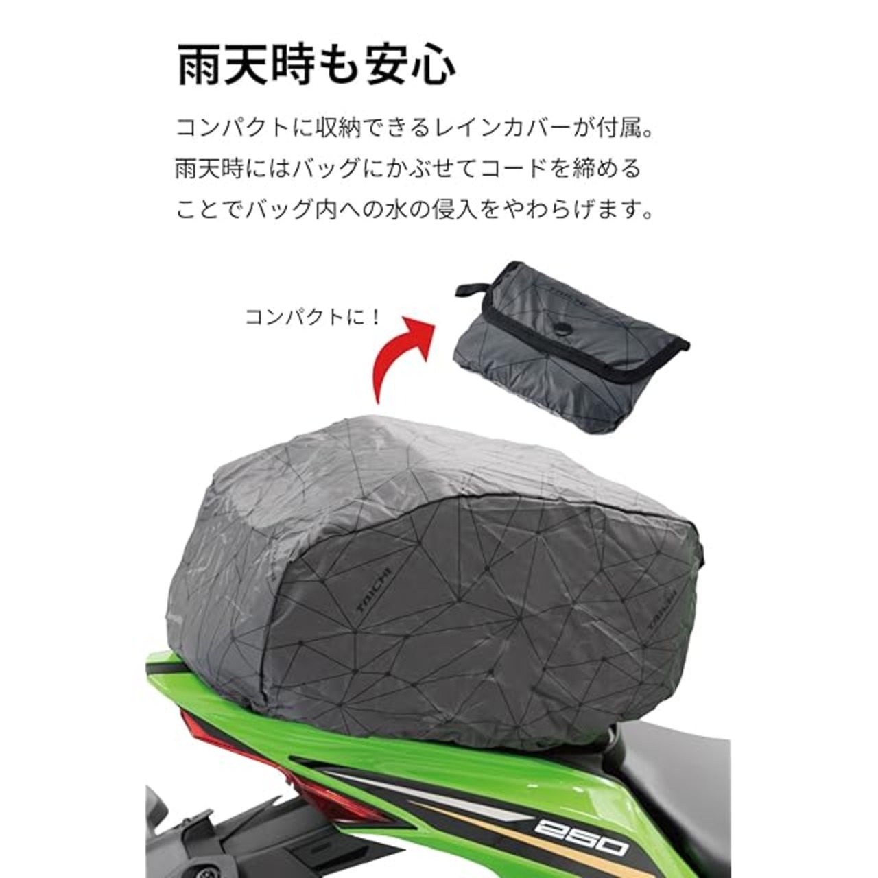 日帰り程度の荷物を積載するのに適度なサイズ。車体固定用ベルトの装着が容易で、様々なシートの形状に合わせやすいオクタフレックスベルトを付属しています。 ※オフロード車等、付属のオクタフレックスベルトがシート下に挟み込めない車両の場合には、別売りのRSB316オプションセッティングハーネスを使用し、フレーム部分や荷掛けフック等への固定が可能です。