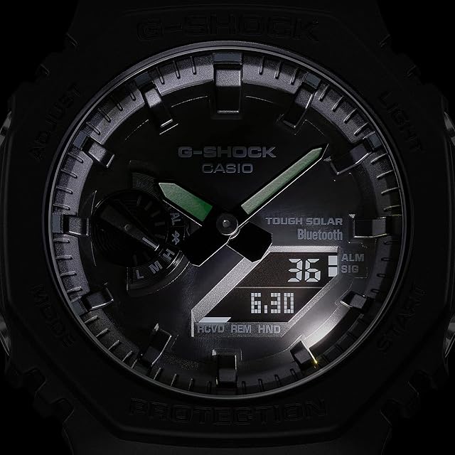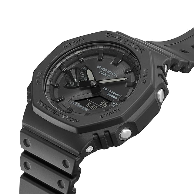 初代G-SHOCKのデザインコンセプトを受け継いだGA-2100の八角形フォルムはそのままに、<br>スマートフォンリンクとタフソーラーを搭載しました。<br> 高機能化に伴う部品点数の増加に対応するため、基板配置を最適化した薄型モジュールを新しく開発。<br> カーボンコアガード構造と組み合わせることで、従来モデルのサイズ感をキープしています。<br>全体をミニマルなカラーリングで仕上げたオールブラックのモデルです。