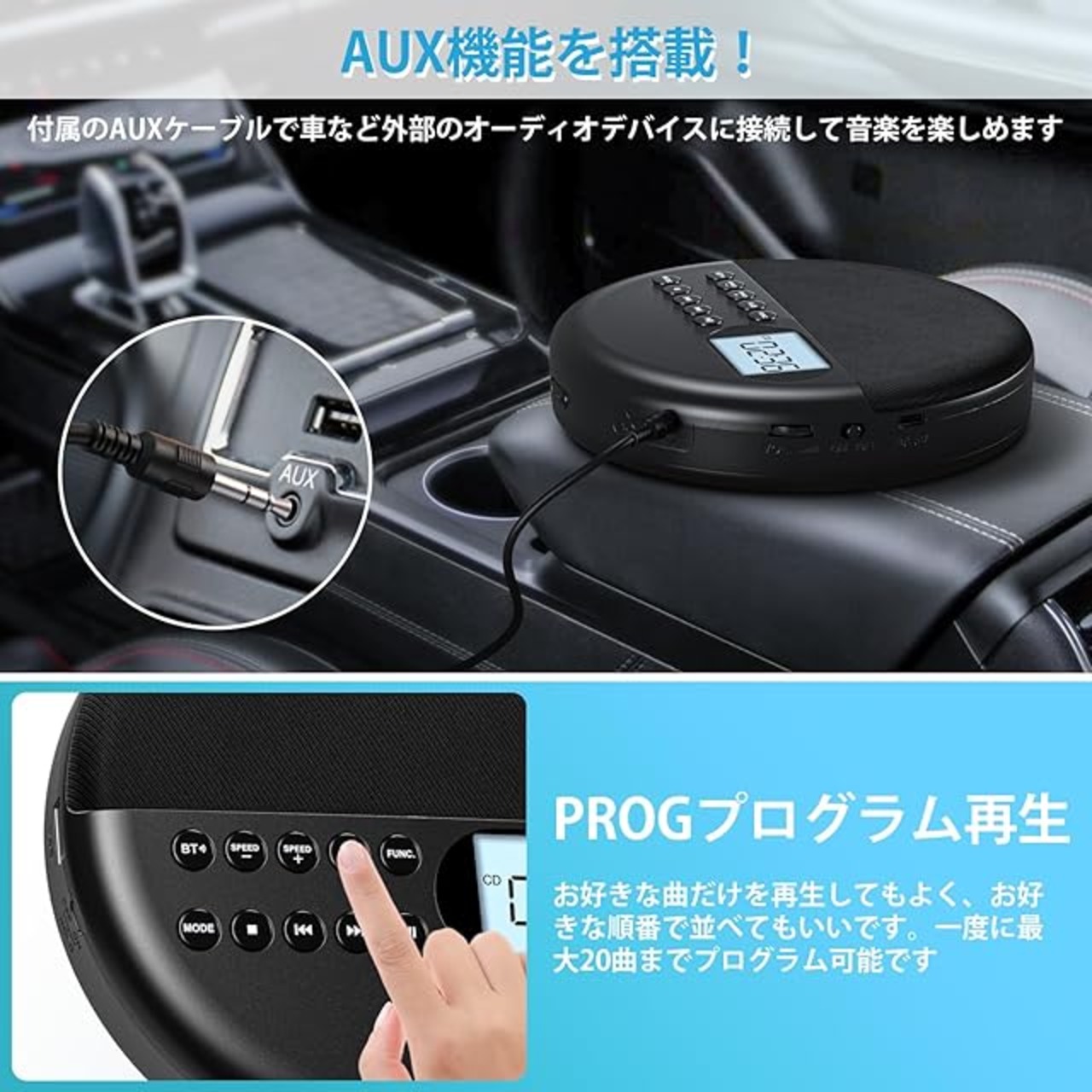 【8種類の再生モード&AUX機能】本CDプレーヤーはPROG再生に対応しますので、お好きな曲だけを再生してもよく、お好きな順番で並べてもいいです。一度に最大20曲までプログラム可能です。PROG再生の他に、本製品はA-Bリピート/単曲リピート/全曲リピート/ランダム再生/フォルダ再生/順番再生と記憶再生など7つの再生モードにも対応します。また、AUX機能も搭載しておりますので、付属のAUXケーブルで車など外部のオーディオデバイスに接続して音楽を楽しめます。
