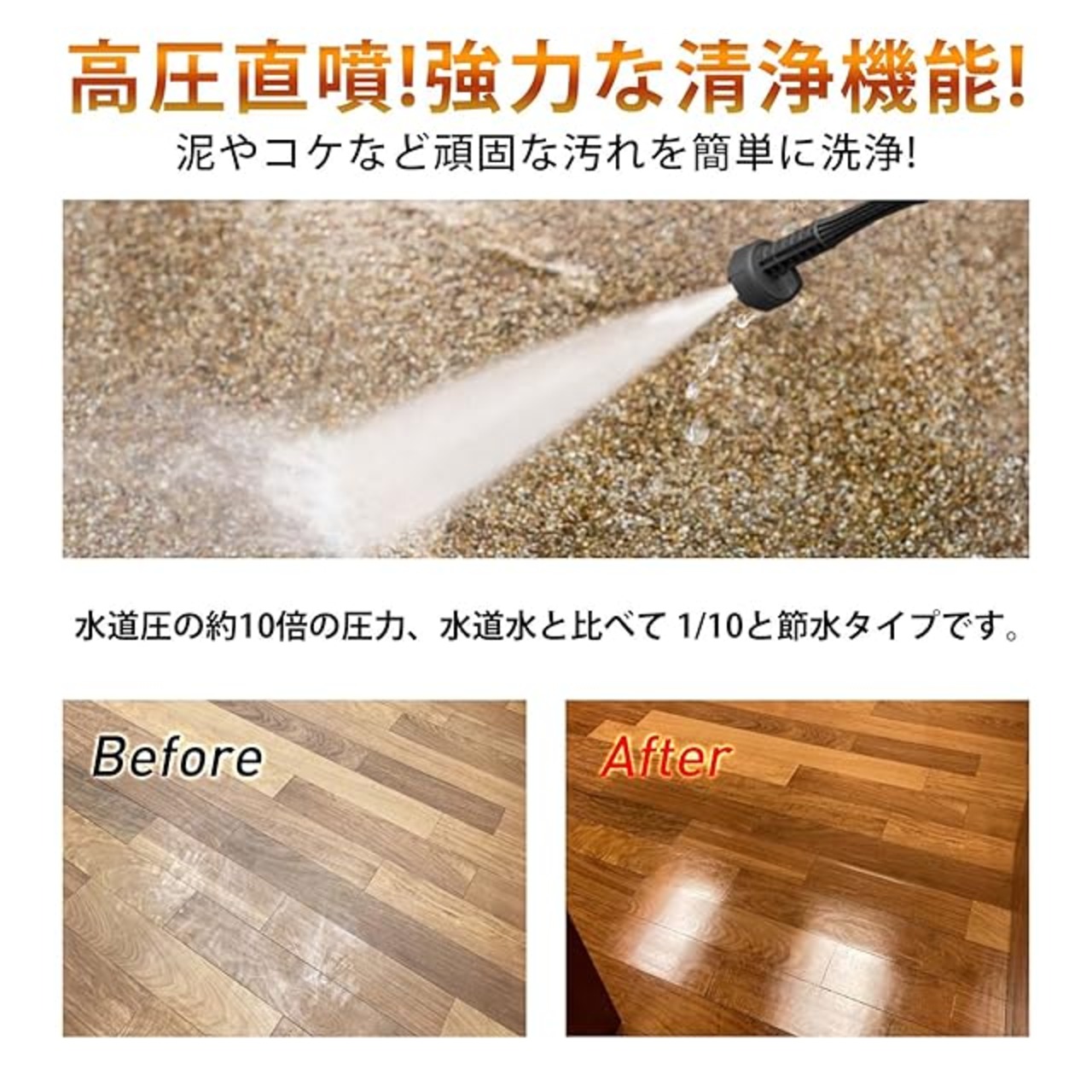 【パワフルなアップグレードモーター】 強力な8 MPaのプレッシャーポンプを搭載し、全銅製モーターと効率的なポンプが組み合わさり、安定した圧力と一定の出水量を提供します。300 Wのハイパワーモーター駆動で、最大250 L/hの出水圧力を実現し、頑固な汚れも簡単に洗い流せます。お車を一新させ、美しい外観を維持できます。