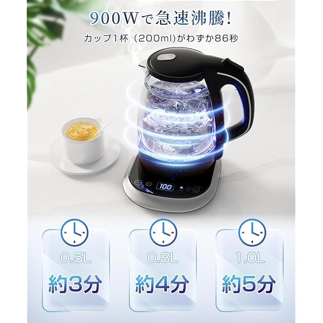 【24時間保温機能で便利さ抜群】 900Wの高出力で急速にお湯を沸かし、カップ1杯(200ml)はわずか86秒で沸騰完了。長時間の保温機能により、お湯を何度も沸かす手間が省け、忙しい朝や長時間の使用にも対応可能です。さらに、エネルギー効率も優れており、日常使いに非常に便利です。