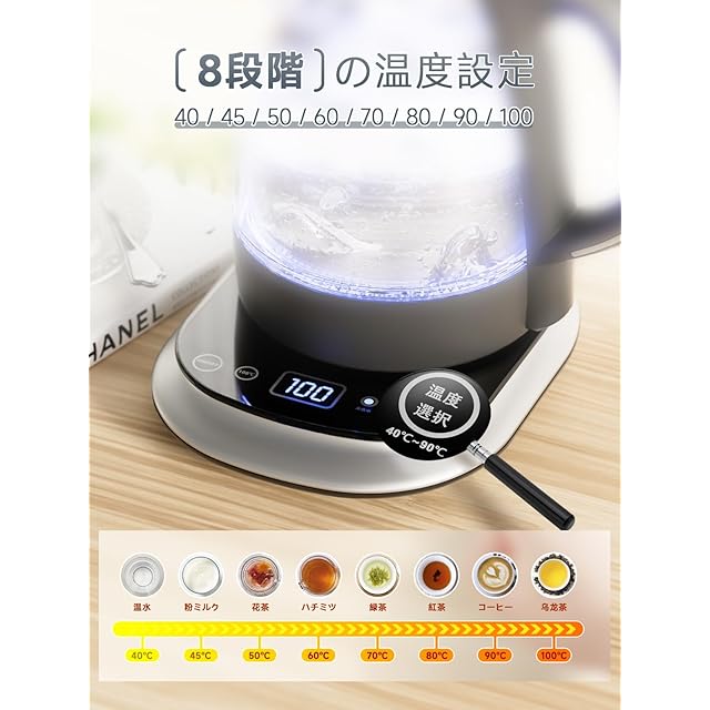 【8段温度調節でお好みの温度を実現】 「40℃/45℃/50℃/60℃/70℃/80℃/90℃/100℃」の8段階の温度調節機能を搭載。赤ちゃんのミルク作りからお茶やコーヒーまで、飲み物に最適な温度を簡単に設定できます!◆デジタルディスプレイで現在の温度が一目でわかり、正確でスムーズな湯沸かしが可能です。