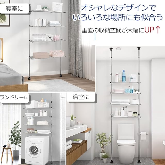 つっぱり棚 洗濯機ラック ランドリーラック4段 突っ張り式ラック 収納ラック 横幅伸縮式 ランドリー収納 ステンレス 段差があっても設置できる 耐荷重20kg 簡単設置 省スペース