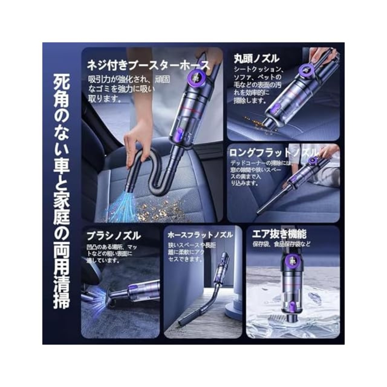 【OLED画面・多機能掃除機】OLEDデジタルディスプレイにより、操作が直感的でスマートです。電量残量を把握し、急に電池切れの心配がいりません。さらに、1台で多機能の掃除機は、取り替えの使用のための種類の付属品と装備されていて、車内に置いておくと、ホコリや食べかすを掃除することができます。家庭でも、マットレスやソファ、窓やキーボードについたホコリや髪の毛などを効率効率的に掃除することもできます。