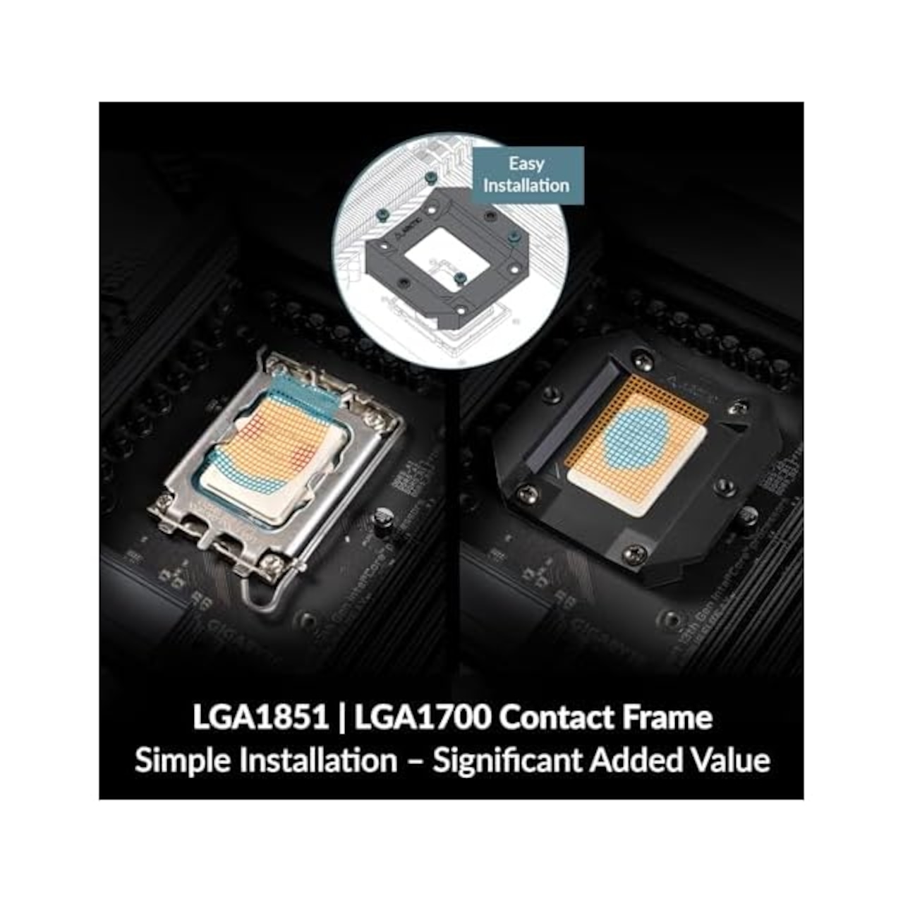 LGA1700コンタクトフレーム - 特許出願中のARCTICのマウンティングフレームはCPUを変形させず、冷却性能の安定化やメインボードとCPUへの物理的な負荷を抑制します。素早く簡単にマザーボードのバックプレートにクーラーを装着可能。