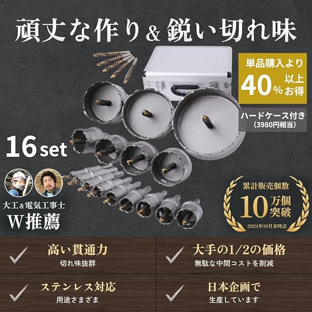 【現役電気工事士・大工推薦&監修】 超硬 ホールソーセット ステンレス 木工 鉄鋼用 対応 電工 16本セット16mm 20mm 22mm 24mm 26mm 28mm 30mm 32mm 35mm 38mm 40mm 45mm 50mm 65mm 75mm 100mm 保管用アタッシュケース付き (16本セットB:16~100mm) | primer