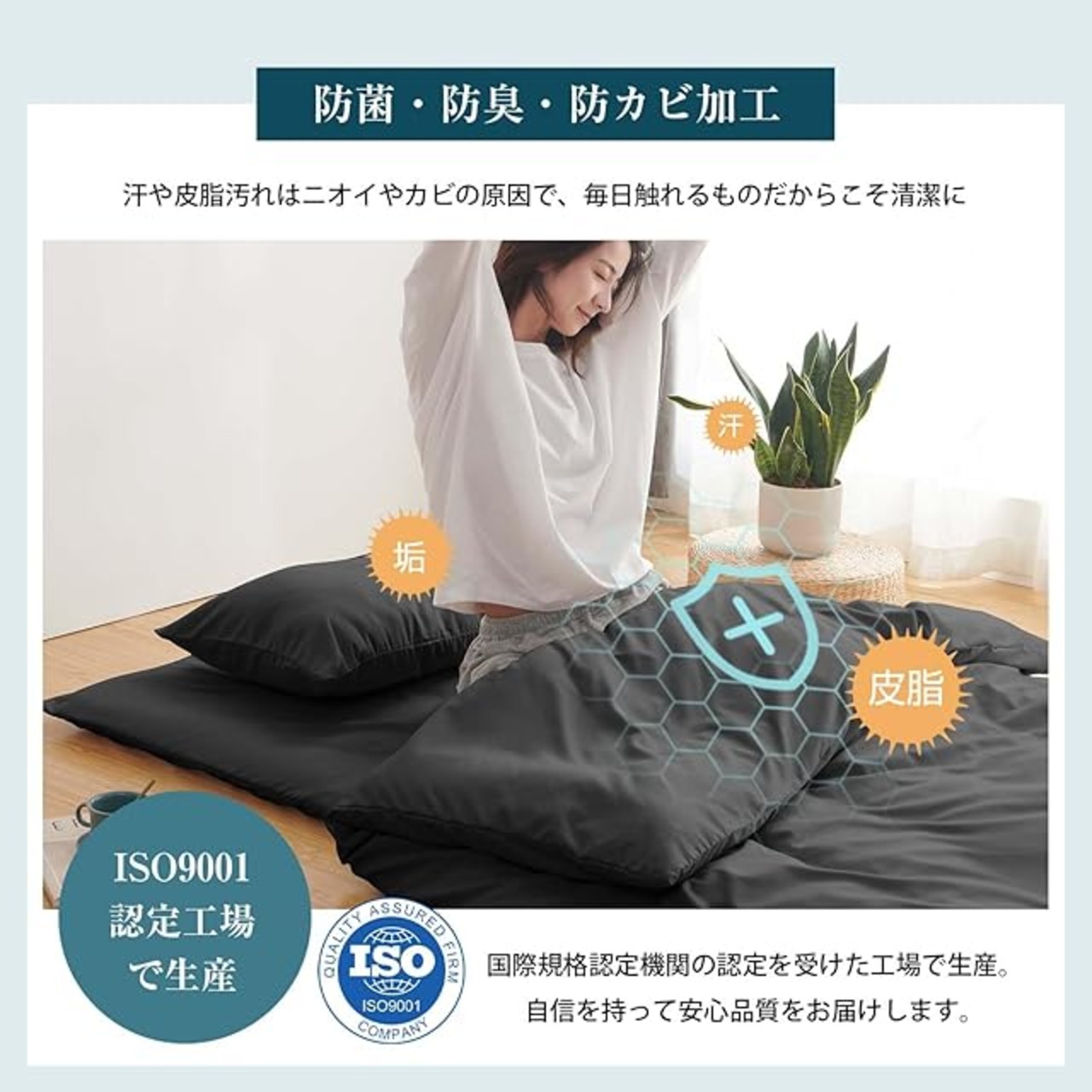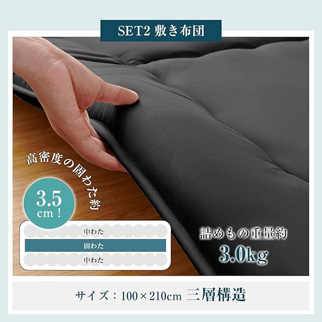 【敷き布団】サイズ:幅100×長さ210cm 側生地:ポリエステル100%(ピーチスキン加工・抗菌防臭加工) 巻き綿:ポリエステル100% 固綿:ポリエステル100%(厚さ約3.5cm) 詰め物重量:約3.0kg 寝心地を左右する敷布団の中材には体圧分散性に優れた高密度固綿を使用、ふんわりやわらかな寝心地ながらもしっかりとサポート、寝返りもうちやすく、身体が沈み込みすぎることなくサポート性と寝心地のバランスが取れた敷布団です。