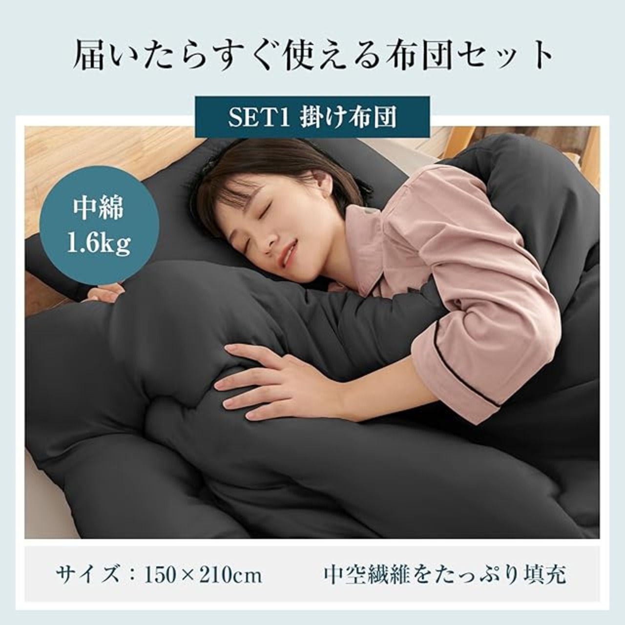 【掛け布団】サイズ:幅150×長さ210cm 側生地:ポリエステル100%(ピーチスキン加工・抗菌防臭加工) 詰め物:ポリエステル綿100% 詰め物重量:約1.6kg カバー用ループ数:6カ所 中空ポリエステルの中わたは体温で温まった空気を蓄えることができるので、保温性に優れています。重すぎず、軽すぎず、ちょうどいいボリュームでオールシーズン使えます。