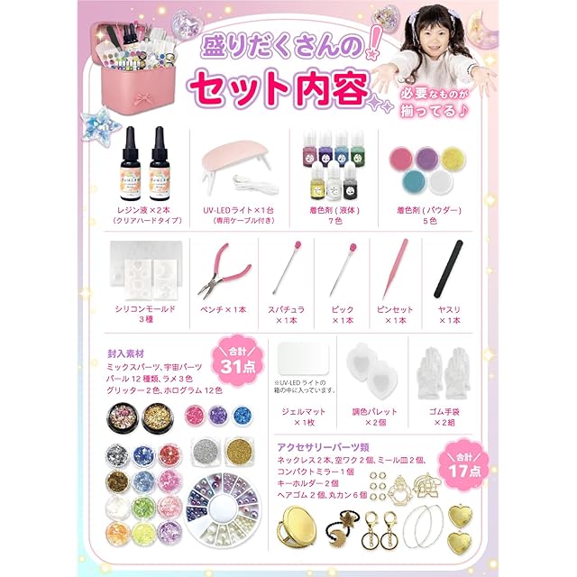 ★アクセサリーパーツ17点★全部で7個のアクセサリーが作れるアクセパーツ付き!デコレーションミラー1個に、ネックレス2個、ヘアゴム2個、キーホルダー2個が入っているので親子でお揃いにしても◎です♪ ★キラキラ素材31点★ときめくのは子供だけじゃない!大人も心おどる、キラキラかわいい素材が31点も入っています♪ ★必須道具29点★レジンクラフトに欠かせない道具が29点も入っているので、届いたその日に始められます! ★レジンクラフトが初めてのお子様も大人も安心して楽しめるビギナーズガイドブック付き! ★お片付けも楽しい?!内側がカワイイ花柄の専用ボックス付き♪