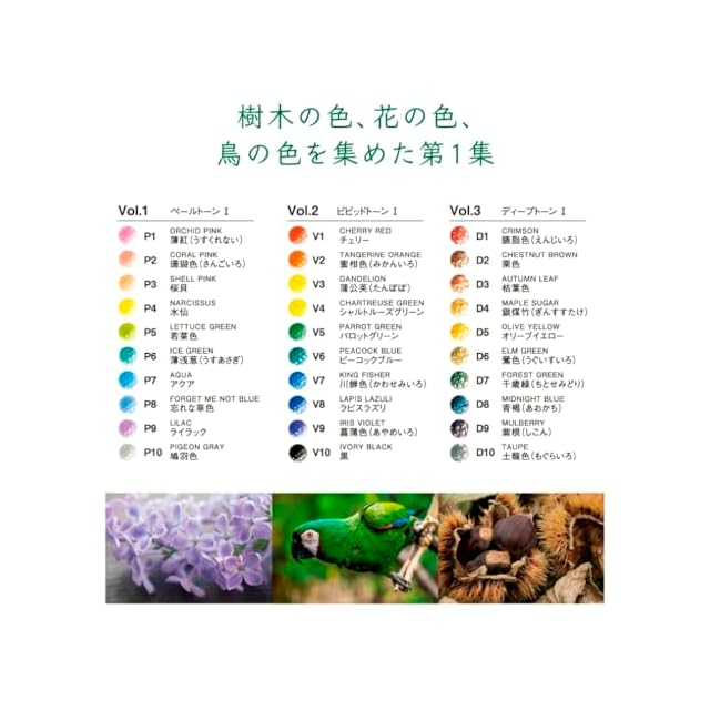 【色鉛筆 色辞典シリーズ】色を楽しむ色鉛筆として自然そのままの魅力を再現した色鉛筆。柔らかみのある中間色を豊富に取り揃え、「カワセミ色」「桜貝」「たんぽぽ」など自然界からもらった魅力的な色名がつけられています。