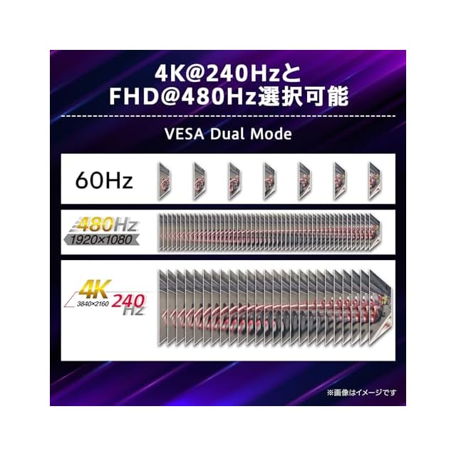 【フルHDで480Hz、4Kで240Hzの2モード切替】 4K有機EL・VESA Dual Mode VESA Dual Modeにいち早く対応。4K(3840×2160)@240HzとフルHD(1920×1080)@480Hz両方が使用できます。また、フルHD表示時は、画面のサイズを24インチ/27インチサイズに切り換えが可能。FPS(First Person Shooting)などで、大画面よりも、一目で表示全体を見渡したいプレイヤーにも最適な環境を提供します。RPGやMMOなど美しい世界観のゲームは31.5インチ4Kの壮大かつ美麗な表示で、FPSなど速度が重要なゲームは24インチのフルHD@480Hzで表示させるなど、好みに合わせてあらゆるゲームを最大限楽しめます。