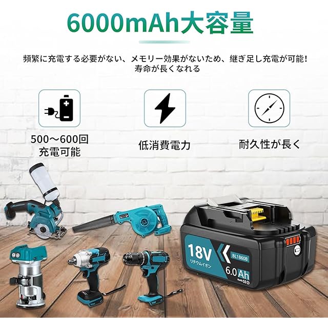 マキタ 18v バッテリー BL1860B マキタ互換バッテリー 18v 18v バッテリー 互換 マキタ マキタ バッテリー 18v マキタ バッテリー マキタ18v <br>商品の説明 <br>型番:マキタ 互換バッテリー BL1860B <br>電圧: 18v <br>容量: 6000mAh <br>電池種類:リチウムイオン 電池 <br>個数:2個 <br>認証:PSEマーク CEマーク取得済み。 <br><br>充電方法:充電方法は純正品と同じです(純正・互換充電器とも充電できます)。 <br><br>対応充電器:急速充電器DC18RC、DC18RDなどに対応できます。 <br>対応機種 <br>ハンマドリル HR202D,HR202DRFX,HR202DZK,BHP451,BHR240,BHR202,BHR202RFE, BHR202Z,BHR240,BHR240Z,BHR241,BHR241Z <br>マルノコHS630D,BSS610,BSS610SFE,BSS610X2,BSS610Z,BSS611X,BSS611Z,BCS550,BSS501 <br>インパクトドライバ TD145D,TD144D,BTD140BTD140Z,BTD141,BTD1444 <br>モードインパクトドライバTP144D,BTP140,BTP140Z <br>アングルインパクトドライバTL061D,BTL061,BTL063 <br>スクリュードライバBFR550L,BFR550Z,BFR750,BFS450など。 <br><br>長期保存に強い <br>自己放電が少ないため、長期保存しても満充電に近い作業が可能です。 <br>高温や過放電、過負荷状態になると自動的に電気を遮断してバッテリーを守ります。<br>品質に自信があるから、できます。 <br> 【マキタ18vバッテリーBL1860B特徴】 マキタ用リチウムバッテリーとして開発されたバッテリーは、純正品と変わらない 使用感でこれまで多くのお客様にご利用頂いております。<br> 強制冷却で(快速)充電><br>自己放電が少ないため、長期保存しても満充電 に近い作業が可能です,制御基板には充電を制御する保護回路を搭載!<br>√小型 軽量 高容量<br>√通常のタイプとほぼ同じ厚みで収納ケースにも収納可能。 <br>専門的な設備で寿命試験を操作しております。<br> ①ボタン破壊試験<br> ②バッテリーを充電器に着脱 <br>③バッテリーを充放電 <br>④落下試験 工場から出荷前に正規テストを繰り返すことで 高品質を守っております。安格ですが、 商品の耐久性や性能は純正品と遜色がないです。自信を持ってお勧めします。 <br><br>【電池ご使用のヒント】 <br>1.新品のバッテリーはご使用の前に満充電してください。 <br>2.新品のバッテリーは満充放電を2-3回繰り返してください。 <br>3.バッテリーを使わずに置いていたら、自己放電しますので、ご使用の前に満充電してください。 <br>4.バッテリーは2-3ヶ月ごとにすっかり使い切った後で満充電しておいてください。 <br>5.電池のショートが起きる危険性があるため、バッテリーを金属部品と一緒に放置しないでください。 <br>6.バッテリーを落としたり衝撃を加えたりしないでください。 <br>7.水分や湿気の多い場所に保管しないでください。
