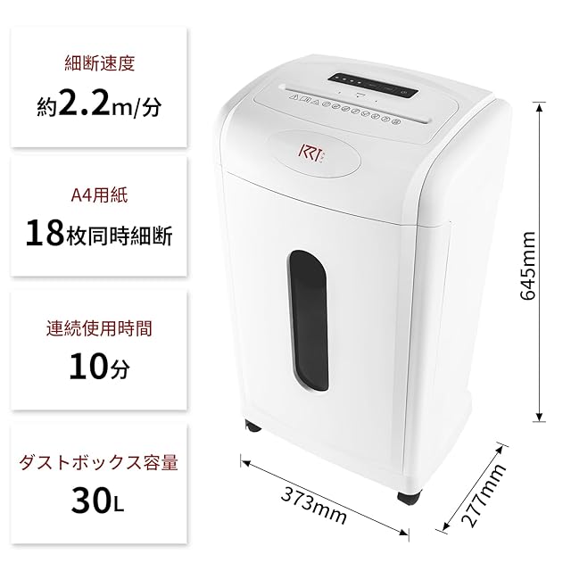 このシュレッダーは、最大同時細断18枚の用紙を処理し、細断サイズは約4x38mmです、さらに、ホッチキスやクリップなどの文房具も細断できます。30Lの大容量収納ボックスに収納し、頻繁な空にする手間を省きます。安全性の保証も万全で、ビジネス情報を確実に守ります。パワフルなのに50dB静音な運転で、快適な作業環境を提供します。文書処理をスムーズにし、効率を向上させるために最適です。