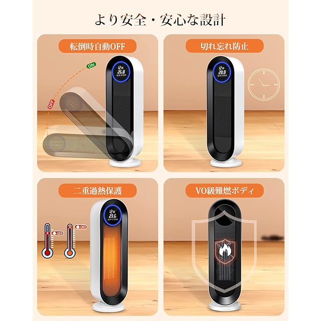 【もっと快適に、安心の暮らしを支える多重安全設計搭載】思わず蹴っ飛ばしたっり、不意の衝撃や地震などで転倒したりしまった時に自動で電源がオフになる「転倒オフ機能」。また、ひーたー内部の温度が上がり過ぎた時に自動で運転停止する「二重過熱防止機能」の安全機能は備えており、使用方法の不注意によるケガや事故が絶対に防げるわけではありません。ファンヒーター 電気の外装素材は「V0級難燃性安全素材」を使用され、高温でも燃えにくく安全性さらに固める。日本国内電気用品安全法(PSE)認証済です。安全・安心・安定・快適・満足な暮らしを提供します。