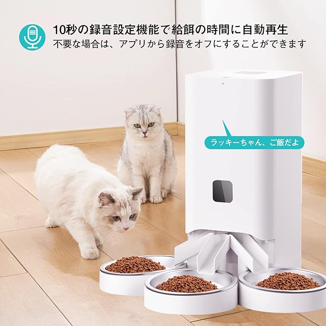 【アプリを使って給餌管理!遠隔でも設定可能】:《自動給餌機能》でワンちゃん・ネコちゃんに毎日決まった時間、決まった量のフードを供給。お留守番の時も規則正しく食事管理できます。一度設定すれば、その後は毎回リピート自動給餌されます。《手動給餌機能》でいつでも”おやつ・ごほうび”♪ 自動給餌設定時間以外にも、アプリの手動給餌ボタンを押すだけで、好きな時にワンちゃん・ネコちゃんへおやつ、ごほうびがあげられます。《給餌記録》でワンちゃん・ネコちゃんの健康管理アプリ内の給餌記録を見れば、日時、フード量、自動or手動の給餌データを確認できます。《遠隔操作》で留守中も給餌できる!またアプリを家族や友達と共有すれば、一緒にワンちゃん・ネコちゃんのお世話ができます。