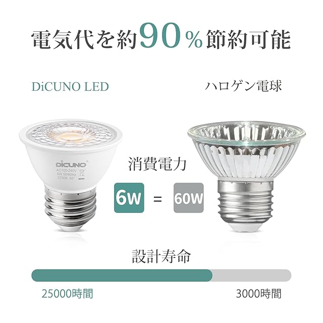 省エネ・長寿命電球:高品質なLEDチップを採用して、消費電力が僅か6Wで、従来の60Wハロゲン電球と比べ、約90%の電気代を節約できます。また、25000時間の設計寿命なので、短寿命のハロゲン電球より、長持ちで頻繁に交換する手間とコストを削減して、家計に優しいLED電球です。