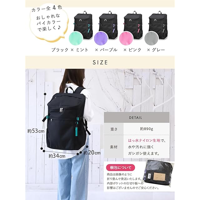 ✅【荷物が多い人向けの丈夫なリュック】部活などで大荷物の学生や、スポーツや旅行・通勤などで大容量のリュックを必要とされている方々向けに丈夫で大容量のリュックを設計致しました。撥水生地で厚めのしっかりとした生地ですが、人体工学に基づいた背負うと軽く感じられる設計を採用。なだらかに傾斜を付けたトップ部分は背負った際フォルムがきれいに見える「美フォルム設計」です。<BR> ✅✅【アクセントのあるバイカラー仕様】ブラックベースのベーシックな外見に対し、内側のカラーは楽しく使っていただけるようインパクトのあるカラーで企画を致しました。ガバっと開き沢山ものが入る使いやすいボックス型構造に、A4B4のノート類などが型崩れしにくい内側ダブルポケットを採用いたしました。<BR> ✅✅✅【ブランド品も製造する良質な工場で生産】縫製にはこだわり、リュックで有名なブランドも生産する縫製工場で生産した丈夫な構造です。商社などを通さず直接生産工場と契約をすることにより大幅なコストカットを実現いたしました。お求めやすい価格でお値段以上の質をお届けいたします。<BR> ✅✅✅✅【丈夫な撥水ナイロン生地】表生地は撥水加工を施した高品質ナイロンを使用しており、急な雨でも中の荷物が濡れる事を防ぎます。(完全防水ではありません)汚れが染み込みにくい素材のため、長くきれいな状態でお使いいただけます。【サイズ】縦53cm×幅34cm×奥行20cm 重さ約890グラム <BR> ✅✅✅✅✅【類似品にご注意ください。お買い物は日本のメーカーで】見た目の画像は同じような商品でも、作る工場や品質・保証対応は全く違います。すぐに壊れる・色が画像と違う・連絡をしても返事がない等色々なトラブルがございますので、販売業者は慎重にお選びくださいませ。日本企業でのお買い物はアフターケアも充実。何かございましたら、弊社日本人スタッフが誠実に対応させていただきます。