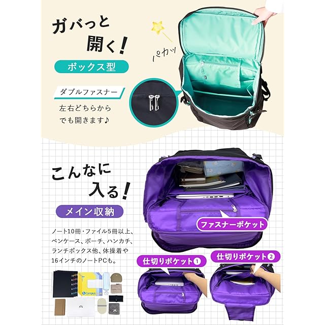 ✅✅【アクセントのあるバイカラー仕様】ブラックベースのベーシックな外見に対し、内側のカラーは楽しく使っていただけるようインパクトのあるカラーで企画を致しました。ガバっと開き沢山ものが入る使いやすいボックス型構造に、A4B4のノート類などが型崩れしにくい内側ダブルポケットを採用いたしました。