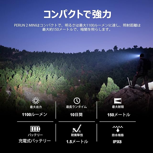 白色と赤色二種類のLED光源を搭載し、Turboモード、Highモード、Mediumモード、Lowモード、Moonlightモード、赤点灯モードといった6つの点灯モードを備え、SOSモードを設定することもでき、様々な照明ニーズに満たすことができ、身周りを危険から守ることもできます。また、明るさは最大1100ルーメン、照射距離は最大約150メートルに達し、周りや前方を明るく照らしてくれます。バッテリーを含めてわずか54gと軽量に仕上がり、持ち歩きやすいです。磁気デザインを取り入れ、鉄や金属に吸着でき、ハンズフリーに作業できます。双方向型のクリップが付いており、バッグ、ベルトやポケットなどに便利に装着でき、両手を解放してくれます。ヘッドバンドは伸縮性、通気性に優れ、長さも調節可能、快適な装着感を実現します。更に、perun 2 miniヘッドライトをベルトから外して懐中電灯としても使用でき、アウトドア活動、ランニング、散歩、自動車整備、夜釣り、修理、登山、キャンプ、防災、停電など様々なシーンで活躍します。