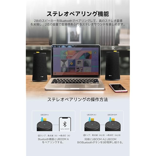 【360°全方位サウンド&先端のDSP技術】:高性能スピーカーユニットを2基搭載し、360度サウンドで臨場感あふれるステレオサウンドを実現します。先端のDSP(デジタルオーディオ信号処理)技術により、音楽再生中のノイズを低減し、クリアでパワフルな高音質サウンドを実現します。ご注意:本製品は2023年より販売されているバージョンと、2023年以前に販売されたバージョンとのステレオペアはできませんので、予めご了承ください。