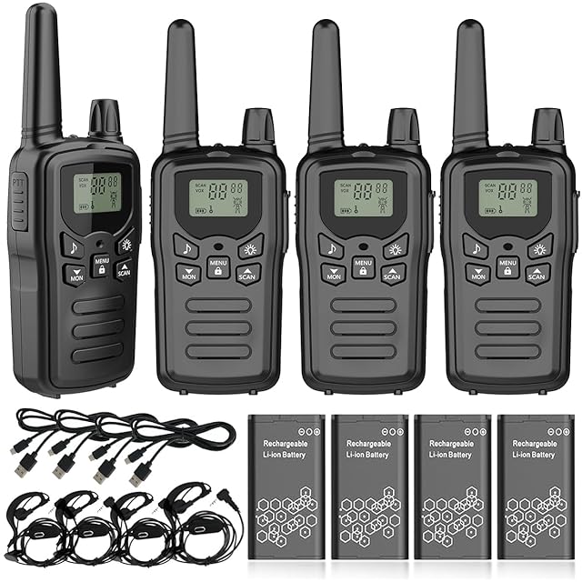 実用的な機能: これトランシーバーセットはVOXハンドフリー機能付き、LED懐中電灯内蔵、耐久性、クリスタルサウンド、自動省電力、ローバッテリーアラーム、オートスキャンチャンネル. 同じチャンネルに設定すると、複数人での通話が可能です、 USB充電機能コスト、環境保護を節約、でき充電機器を見つけるのは簡単です。