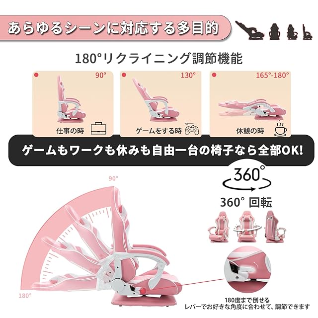 【フル機能のゲーミングチェア】最大180度まで調整可能、特別なスクラッチ/滑り止めパッドが付いた360度回転機能で、お好みの方向にチェアを回転させることができます。360度回転機能により、スムーズに立ち上がって物を取ることができます。
