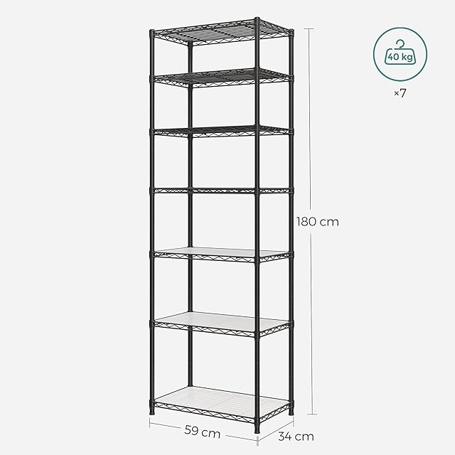 【商品仕様】本体:スチール(粉体塗装)サイズ:7段 幅59cm×奥行34cm×高さ180cmラック全体耐荷重:280kg 棚板1枚:40kg お客様にて組立の商品です