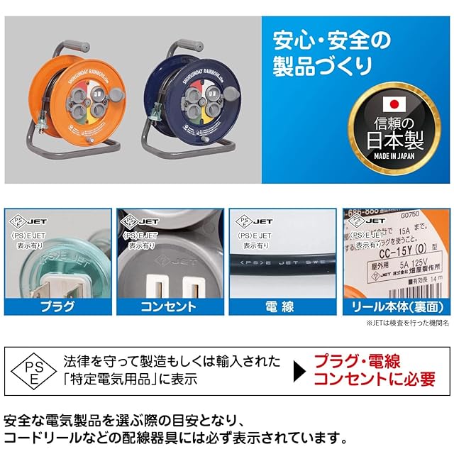 【仕様】本体サイズ:幅25.8×奥行20.7×高さ32.9cm/本体重量:3.5kg/ケーブル:VCT 1.25m㎡×2C×15m/コンセント:防雨型2P 125V 15A(4口)/プラグ:防雨型2P 125V 12A/製品定型:125V 5A(許容電流15A)