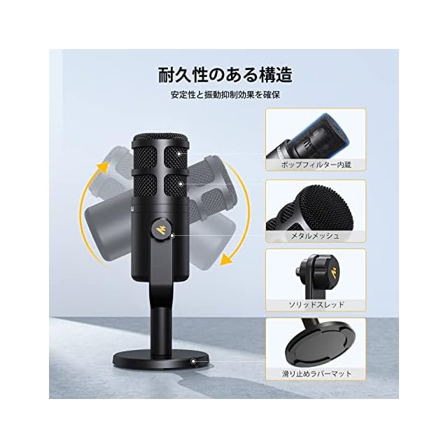 【頑丈なオールメタル構造】シンプルでスタイリッシュなXLRマイクには、6cmの取り外し可能なマイクホルダー延長ロッドが付属しており、マイク角度を上下270°に調整可能、快適な高さと位置を得ることができます。滑り止めラバーマット付きの厚い台座は、安定性とデスクトップからの振動を抑制し、クリーンな音を提供します。また、3/8"-5/8"標準サイズのマイクブームアームと併用することができ、より多くの選択肢を提供します。(ブームアームは含まれていないです。別購入する必要があります。)