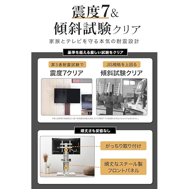 【震度7での耐震試験済み】震度7・阪神淡路大震災を再現した起震車試験を実施。40kgダミーテレビ・耐震金具なしの同条件でテレビボードの据え置きと比較したところWALL INTERIOR TV STANDには転倒は見られませんでした。※自社基準に基づき耐震性を実証しています。すべての環境での耐震性を保証するものではありません。