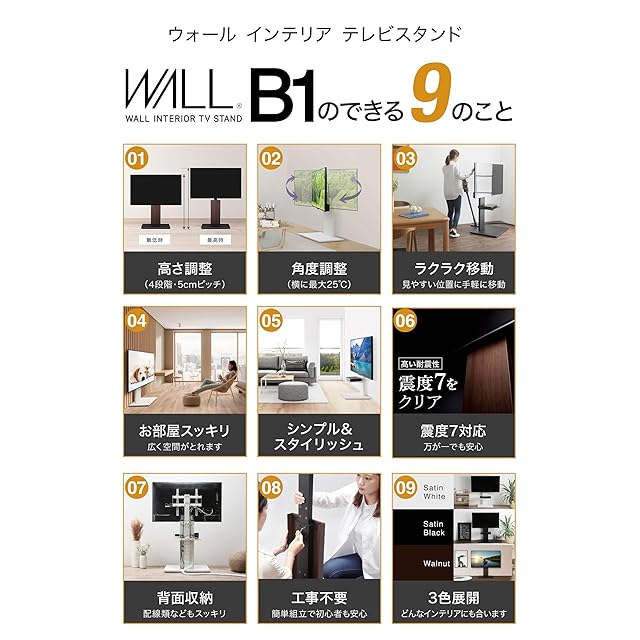 WALL B1 テレビスタンド 隠しキャスター付き 首振り ロータイプ ウォールナット 耐震 震度7対応 高さ4段階調整 32~65インチ対応 可動式 移動式 自立 壁寄せ テレビ台 穴開けない 工事不要 組立簡単 背面収納 おしゃれ 壁掛け風 tv stand EQUALS イコールズ ウォール