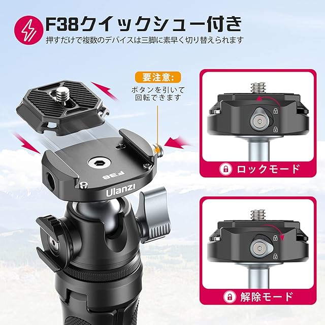 【F38クイックシュー卓上三脚】Ulanzi スマホ 三脚は新しいデザインを発表し、F38クイックシステムと卓上三脚の組み合わせ。クイックシュープレートの1/4ネジより、スマホホルダーやカメラなとと取付、ボタンを押すだけで、カメラと三脚&雲台の間にクイックリリース化して脱着の手間が大きく省けます。 横側はアクセサリーシューがあり、スマホ、ミラーレスカメラ、ビデオカメラと他のデバイスを接続するときにLEDライトやマイクなど動画撮影に必要な機材をマウントできます。