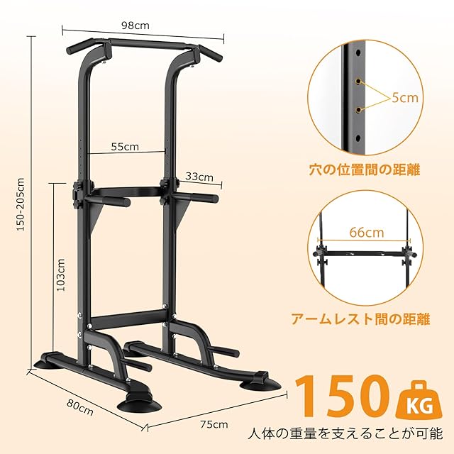 製品サイズ:懸垂マシンの本体重量は約13kgで、ぶら下がりの本体寸法は幅約98cm、奥行き約80cm、高さ約150~205cm(チンニングスタンドの高さは10段階調節可能)です。最大耐荷重は150kgです。