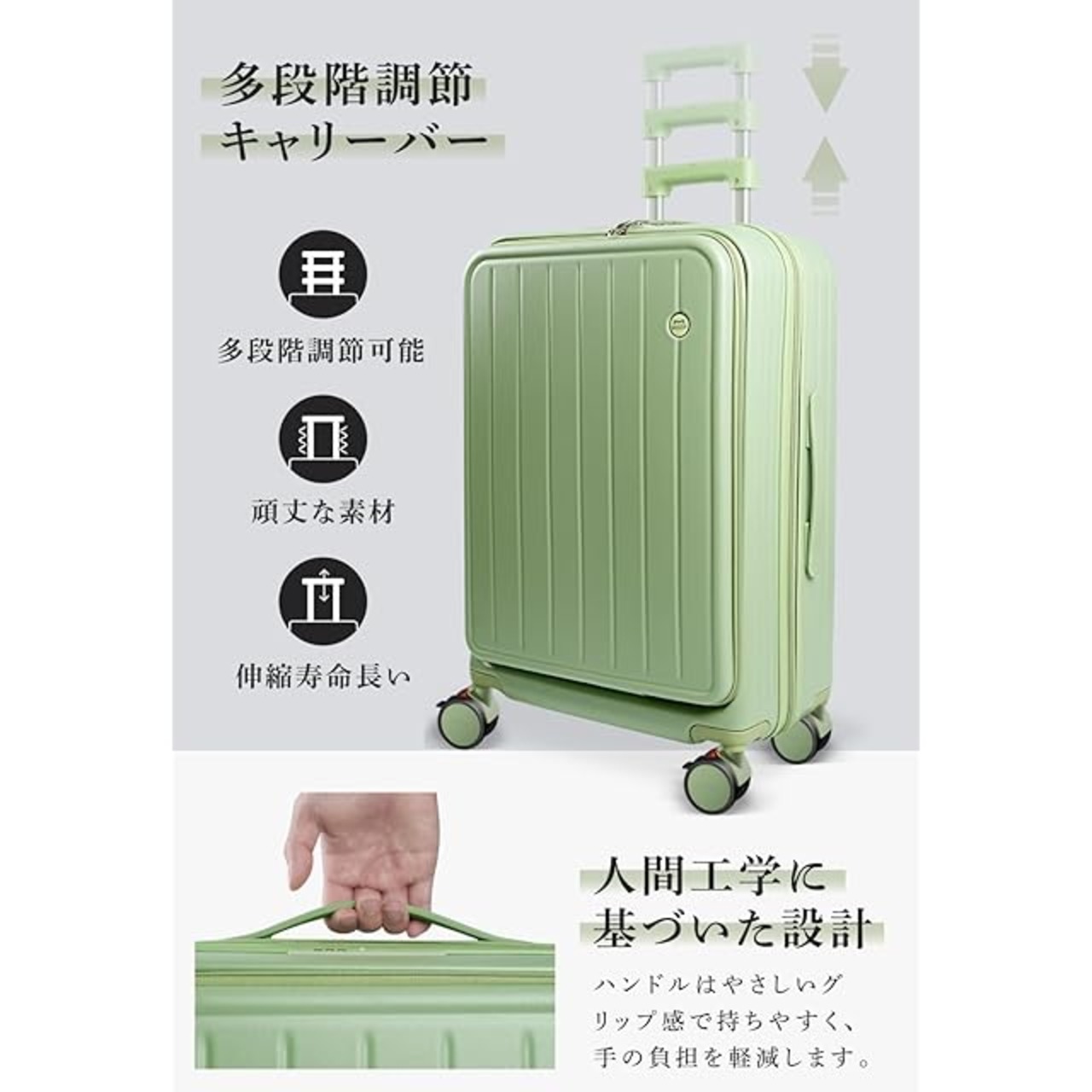 【便利な操作設計】①スーツケースには操作しやすいTSAロックとスムーズなジッパーを採用しており、素早く簡単に開閉が可能です。 ②ドローバーの高さはさまざまな身長の人に合わせて調整できるため、牽引時により快適になります。 ③人間工学に基づいたハンドルのデザインで、長時間持っていても疲れません。