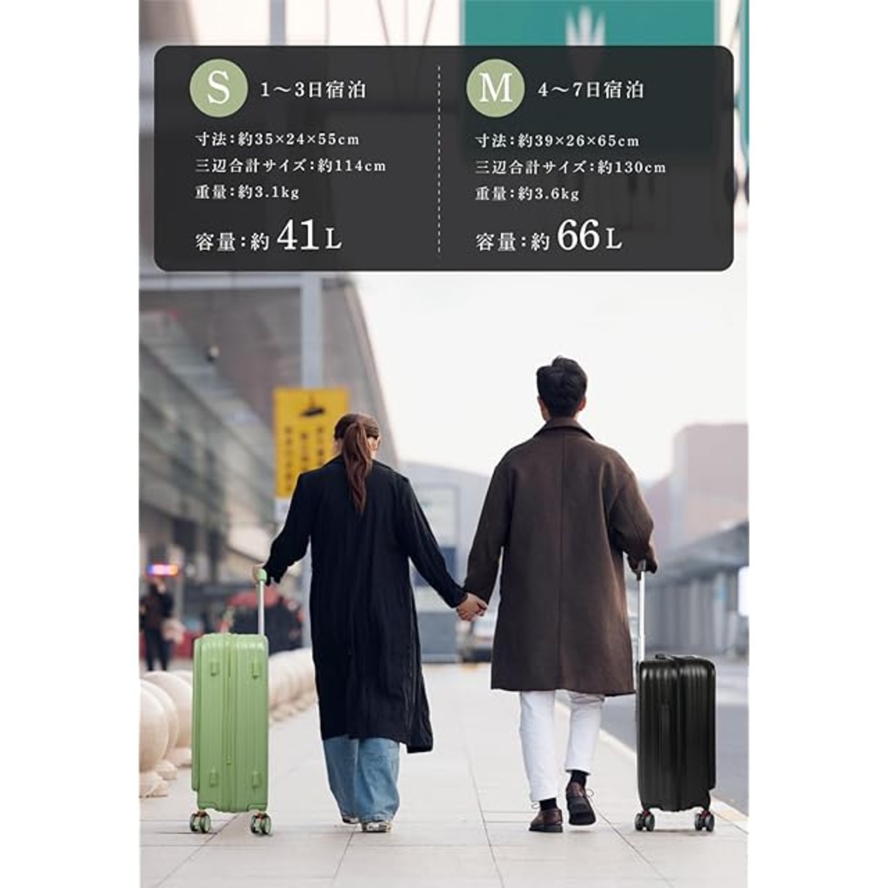 【表地&超軽量】PC(ポリカーボネート)+ABS樹脂、機内持ち込みOK (Sサイズ):約:約35×24×55cm、三辺の和は112cm、容量は約41L、重量は約3.1kgです。超軽量で、女性でも楽々に持ち出かける人気なキャリーケースです。