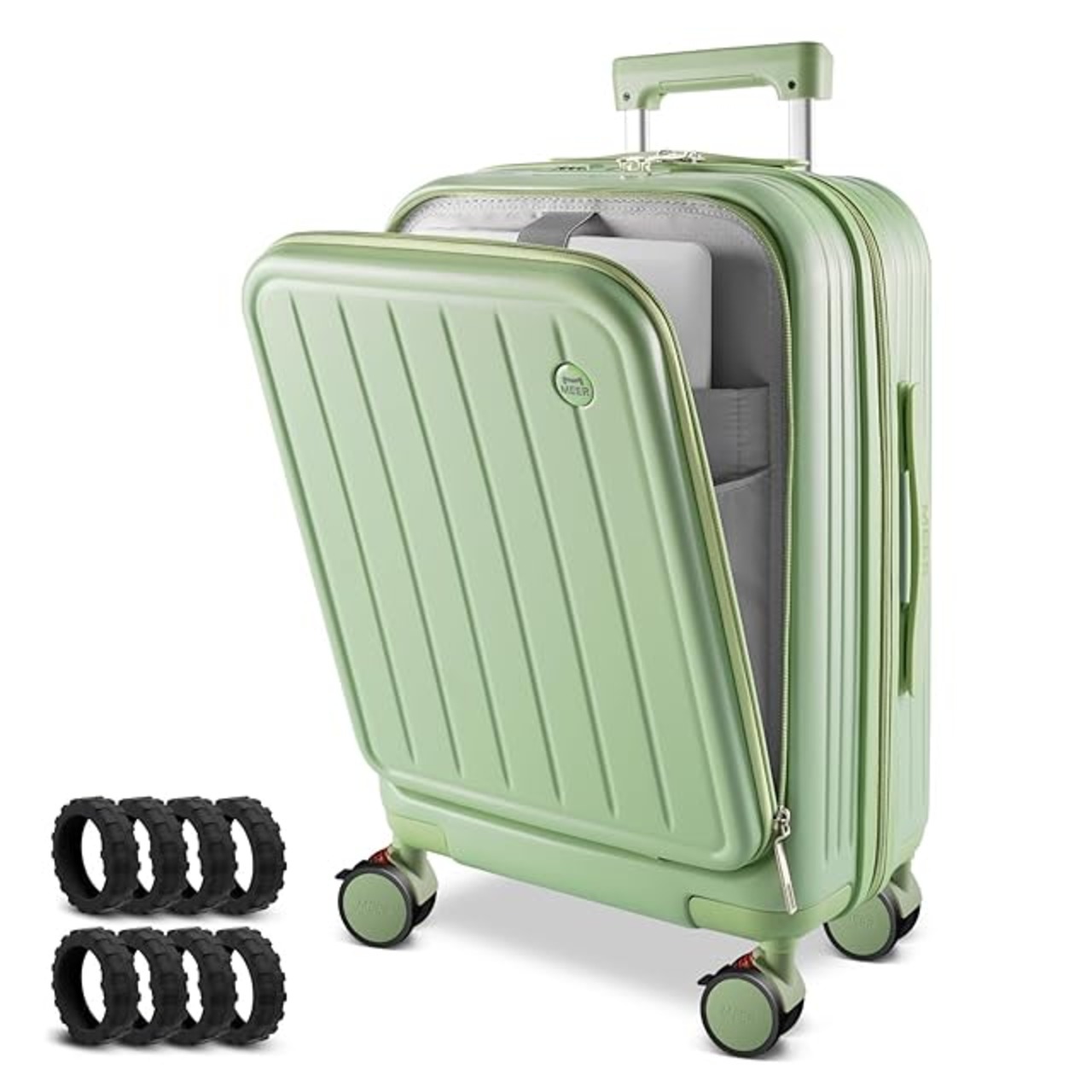 [meer] 前開き スーツケース 多機能フロントオープン キャリーケース ストッパー付き キャリーバッグ カップホルダー付き 超軽量 360度回転 耐衝撃 TSAロック 静音 頑丈 海外旅行 国内旅行 ビジネス 出張 (グリーン, Sサイズ ストッパー付き 約41L)